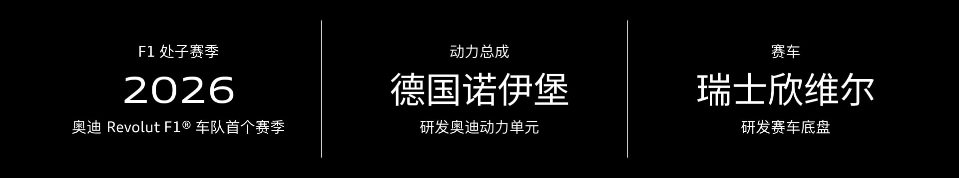 奥迪 F1 赛车部分,由奥迪方程式赛车有限公司在瑞士欣维尔的工厂研发而成。该基地距苏黎世约30公里,自2026年起,奥迪 F1 的赛事运营也将在此地进行。该工厂原为索伯赛车运动股份公司所有,瑞士索伯车队自1992年至2025年持续征战 F1 世界一级方程式锦标赛,2022年10月,奥迪正式确认索伯车队为 F1 项目战略合作伙伴,并于2023年初收购其少数股权,2024年3月,为全面进军 F1 赛事,奥迪进一步全资收购瑞士索伯集团,不仅为奥迪 F1 项目带来逾三十年的顶级赛车经验,更为引入卡塔尔主权财富基金作为投资者奠定基础。